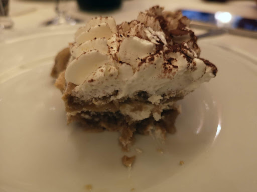 2 strati di savoiardi bagnati nell'acqua al sapor di caffè ricoperti di panna e una spolverata di cacao in polvere...