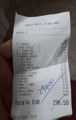 Infine, vorrei evidenziare un aspetto che ha contribuito notevolmente alla mia delusione. Trovo assurdo il fatto che il festeggiato abbia pagato i coperti extra dal menù fisso per tutti i partecipanti e 9 amari, visto che aveva portato più di 20 persone.. si è cercato poi di rimediare invano facendo ben 6,50€ di sconto in cassa (in foto lo scontrino degli extra menù).