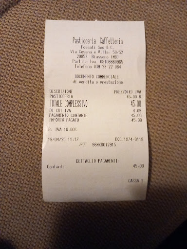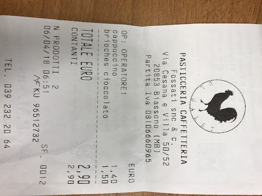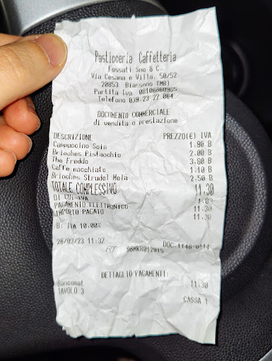 Read moreLA PASTICCERIA E CAFFETTERIA FOSSATI MI E’ STATA COSNIGLIATA DA UN AMICO ….VAI E TROVERAI ALTA QUALITA’. BEH QUALCOSA DI ALTO L’HO TROVATO IL PREZZO. IL GIUDIZIO SI LIMITA SOLO ALLA COLAZIONE CAPPUCCINO E BRIOCHES AL CIOCCOLATO PER SOLI EURO 2,90!!!! ARRIVO ALLE 07:00 ED ALL’INTERNO IL PICCOLO BANCONE CAFFETTIRA E’ OCCUPATO DA 3 PERSONE, VABBE’ OCCUPO IL TAVOLINO, VEDO CHE TRA LE BRIOCHES ESPOSTE IN VETRINA NON C’E’ QUELLA AL CIOCCOLATO, STRANO….ALLORA CHIEDO SE FOSSERO FINITE, IL BARISTA MI RISPONDE CHE CI SONO….MI FA RIEMPIERE UNA VUTOA CON CREMA AL CIOCCOLATO….PENSO OK SARA’ BUONISSIMA….. MENTRE BEVO IL CAPPUCCINO (BUONO IL CAFFE E CREMOSO IL LATTTE) MI ARRIVA LA BRIOCHES CON UN ACCETABILISSIMA QUANTITA’ DI CIOCCOLATO, AL PRIMO MORSO MI ACCORGO CHE LA CIOCCOLATA E’ FREDDISSIMA,STONA CON LA BRIOCHES TIEPIDA…..VABBE’ CIAO. FINISCO E VADO ALLA CASSA ED IL CONTO E’ SALATISSIMO 1,40 EURO PER IL CAPPUCCIO E 1,50 PER LA BRIOCHES CON L’AGGIUNTA DEL CIOCCOLATONON COMPRESO NEL PREZZO STANDARD!! A BIASSONO!!! QUASI TRE EURO CAPPUCCINO E BRIOCHES SIETE CARISSIMI....