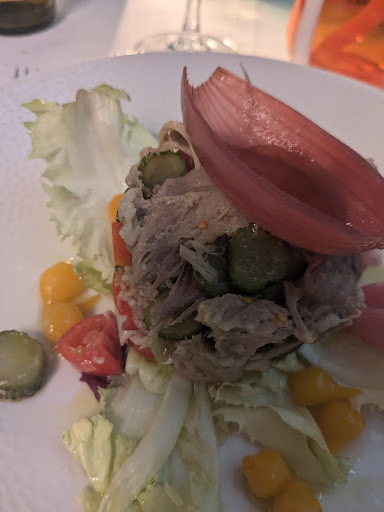 Read moreIl cibo è molto buono anche se le porzioni non sono abbondanti, il servizio al tavolo attento, menù del giorno e carta dei vini adeguati. Quello che è venuto a mancare, nel nostro caso, è stata l'attenzione al cliente in presenza di una comitiva numerosa e rumorosa che rendeva impossibile la conversazione anche a noi quattro appartenenti al medesimo tavolo; avevamo già ordinato i secondi e per rispetto all'oste siamo rimasti, ma siamo scappati via prima del dolce, la confusione era davvero insopportabile. Il giudizio è certamente influenzato dalla situazione contingente ma il gestore non può fare spallucce se un cliente fa notare il proprio disagio (riferendosi alla comitiva la giustificazione suonava piò o meno così: si viene al ristorante per stare in compagnia - non per fare casino e disturbare gli altri avventori, però); per questa mancanza di rispetto verso le "minoranze" credo non ritornerò più in...
