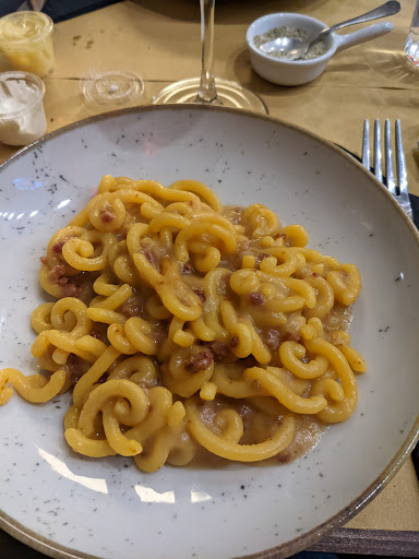 First of all, very friendly and professional staff. We felt very comfortable. Thank you for your kindness. Second of all, we liked the sourdough bread and the homemade sauces, we thought that it was special. The wine was very good, enjoyed it a lot. But the main course didn't convince us too much tbh. The pasta was too al dente (the gramigna, the maccheroni was fine) and very salty, so that I couldn't really eat it. Therefore the desert was tasty. And we didn't understand the concept. Nice wineglasses but plastic cups for water doesn't make too much sense. Other than that, good experience, had a lovely evening and would come...