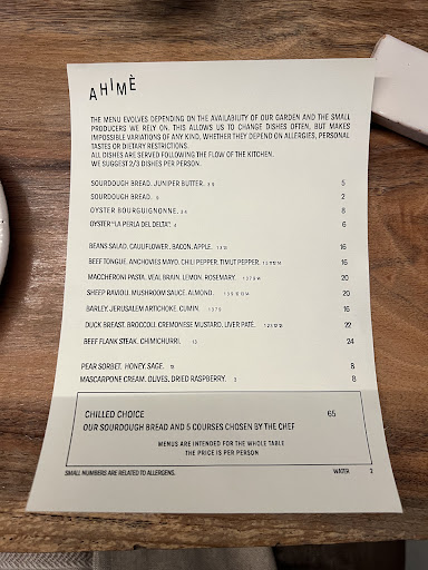 Read moreFirst of all I’d like to say that we were really looking forward for our dinner in Ahimè and arrived at the restaurant open minded and curious. We were very pleased by the service, the atmosphere was also very nice. We took the chilled option with 5 courses that the kitchen picks for you. First of all we liked the first dish and thought the evening would go crescendo, unfortunately we were very fast disappointed to get only the vegetarian options from the menus when the chilled choice cost 45 euros and you could assume you would get at least 1 item from the non vegetarian ones standing on the menu. I think that should be something the guests should be informed of (I’m maybe old style). Second, if the menu had been vegetarian but the food exceptional it would have been totally fine, the main problem for us was that, out of 5 dishes 3 were looking exactly the same, covered by a thick white sauce. The second and the last course were basically both the same, one being a like milk rice with mini pastas and the last one milk rice as well but with tapioca. I mean eating 3 dishes out of 5 with a spoon is to my opinion too much. And also being a wine amateur I would have preferred the waiter to suggest me a white wine if he knew everything would be vegetarian and with white sauce. Cause I asked him if we should get white or red to pair with the menu they would pick for us and he said both would go which wasn’t the case. Maybe we were just unlucky with the menu but I have to say we were quiet disappointed from the food considering the price paid. The rest (service and atmosphere) as I said was...