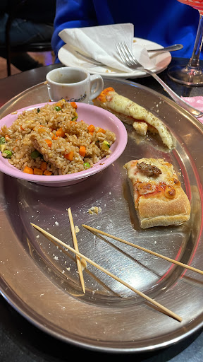 In principio era il caos, badanti, muratori e coppie fameliche, il tutto guarnito dallo spirito del Santo Natale. Una volta entrati ci ha accolto una perspicace barista con a cuore la nostra sete alcolica. Arrivati i Campari spritz a base di lacrime e vergogna I baristi hanno provveduto a portarci l’apericena da noi richiesto. Piatto multietnico asse Lidl-Pechino che comprendeva tranci di una discutibile pizza con gusti ispirati ai 7 peccati capitali: Gola, una margherita con salsiccia, Accidia, una quattro formaggi fetente, Lussuria, cotto e funghi dove di cotto c’era solo la pizza. Patanazze sabbiate a fresa a forma di dado, club sandwich con uova di picciona e prosciutto di fagiana. La portata terminava con il piatto cardine, una ciotola per cani di riso alla cantonese adeguatamente calcinato da una coppia di muratori Rumeno-Vietnamiti, i baristi. Il tutto guarnito da tazza di salsa di soia che pareva un orzo macchiato con aceto in tazza fredda e ravioli cinesi vergogna della dinastia ming. Favoloso, non conosco altra favella per descrivere tale esperienza. Hasta la victoria siempre,...