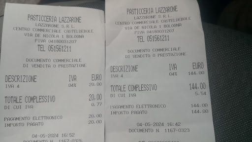 Read moreSmisi anni fa ad andarci perché alcune cose nel servizio non mi piacquero. IL 19 marzo/24 festa del papà ci son tornato,ho acquistato dei biscotti misti di loro produzione Buonissimi staff efficiente,mi dà lo Scontrino del peso col totale € 9,37,vado alla cassa c'è una signora anziana presumo la titolare,pago con Carta € 9,50. Questa mossa non mi è piaciuta, è solo una questione di Correttezza nei confronti del cliente,non è cambiato nulla 👎🥵👎🥵👎🥵👎 Allego le due Ricevute