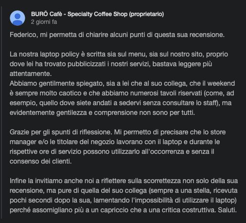 Edit per gli amministratori della pagina - Tengo a replicare perché non gradisco il meccanismo che garantisce l'"ultima parola" al business: Il nome del locale è " BURŌ Cafè - Specialty Coffee Shop", non "BURŌ - Co-working"; Non esiste alcuna "laptop policy" sul vostro sito (ho scaricato ogni pagina in html questa mattina); Nel vostro locale, che è orgogliosamente descritto come "ibrido", manca una comunicazione adeguata, sia visiva che verbale. Sarebbe invece necessaria, data la scarsità di informazioni concrete sul vostro sito. Quando siamo entrati abbiamo letto gli orari, la scritta "smart working" sulla porta d'entrata e null'altro; Non essendo accolti dal personale, ci siamo cercati un posto a sedere come si fa nei caffè di tutto il mondo, anche quelli di New York in cui ci si ferma col laptop a lavorare; Abbiamo accuratamente evitato di sederci in tavoli occupati o prenotati e un gruppo di clienti ci ha fatto spazio a un tavolo grande dove avanzavano due posti; Vedendo che una cameriera passava tra i tavoli a prendere ordinazioni, la abbiamo aspettata, abbiamo ordinato due caffè e chiesto la password del wi-fi; Non la stessa cameriera ma un'altra persona, dopo qualche minuto, è venuta a chiederci di non usare il laptop. Noi abbiamo preferito cambiare aria: Questo numero ha fatto perdere molto tempo produttivo a me e al mio collega (due persone, due recensioni), creandoci non solamente un disturbo, ma anche un danno; È questo il rischio di gestire male un locale che dovrebbe accogliere chi sta lavorando: creare danni, anche economici; Dunque, considerato tutto: ---una stella per il cibo solo perché non ci si può astenere (le policy "verbali" ci hanno impedito di servircene) ---una stella per il servizio perché per noi è stato un disservizio ---una stella per l'ambiente perché la comunicazione visiva non è coerente e crea incidenti diplomatici e perché ci si trova costretti a lasciare il locale alla vista, noncurante, della titolare Mi dispiace, infine, constatare che non c'è alcuna comprensione della banalissima natura del mio consiglio circa la mancanza di rispetto da parte della titolare nel sedersi col laptop a un tavolo in mezzo ai clienti ai quali tale pratica non è, invece, consentita. È una cultura, è una sensibilità. E chi non la mostra fa male solo a se stesso. D'altra parte, anche la natura delle risposte ai commenti conferma la cultura d'impresa del locale, che merita la unica stella che ho messo al cibo. Accusare di scorrettezza un cliente deluso e ridurre la sua recensione a un capriccio è affare di livello molto, molto basso. Peccato. Potreste essere meglio di così, basterebbe poco.