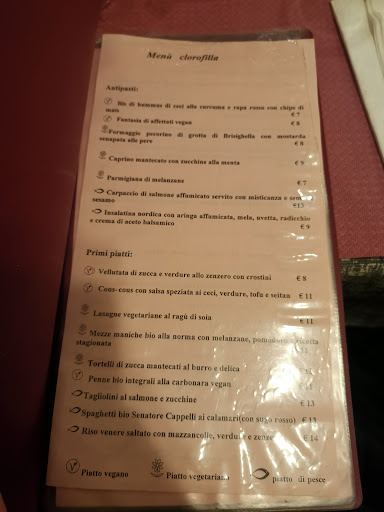 La nostra esperienza al Clorofilla è stata particolare, tutto "merito" del servizio. Parto col dire che le pietanze sono buonissime e fatte con cura: l'antipasto con l'humus è squisito e certi dolci sono ancora meglio (il budino al mango è da capogiro). Qualche pecca nel cibo c'è comunque, tipo trovare le olive non denocciolate nel pane - col rischio di rompersi un dente - o lo spaghetto allo scoglio non proprio eccezionale. C'è un grande però, oserei dire immenso: la ragazza che serve ai tavoli. Quasi sicuramente questa cameriera è la figlia della titolare (quest'ultima persona squisita) perché, altrimenti, non si capisce perché abbia ancora un lavoro. Oltre alle dimenticanze e al modo di fare non sempre cortese, la ragazza in parola ha fatto uno degli errori più clamorosi che io abbia mai visto, ossia proporre un piatto non vegano alla mia ragazza (che aveva detto almeno 10 volte di essere vegana e di volere una crostata, appunto, vegana) e darle poi la colpa del suo errore. In sintesi: vengono ordinate due crostate vegane ai frutti di bosco, la cameriera dice che sono finite e ci sono solo alla pera ma sempre vegane (nel menu vi era anche una costata alla pera non vegana), dopo aver ribadito che 2 persone al tavolo erano vegane la ragazza ci rassicura e va a dare la comanda in cucina. Arrivano i dessert e ci accorgiamo subito che tali crostate non erano vegane. Dopo aver chiesto delucidazioni in merito, la cameriera chiama la titolare per risolvere il problema. Una volta arrivata, la ragazza dice che siamo stati noi a chiedere quel dessert ma, in realtà, era stata proprio lei a dirci di prendere quel piatto perché l'altro era non disponibile. Conclusione? La titolare ci ha portato, FINALMENTE, la crostata vegana ai frutti di bosco (ma non era "non disponibile"?!) Posso solo dire che la titolare, per fortuna, è intervenuta immediatamente in nostro soccorso e ha tentato di risolvere la situazione al meglio. Rimane però l'amaro in bocca per la vicenda e per altre piccole pecche, non credo che torneremo e non sento di consigliarlo...
