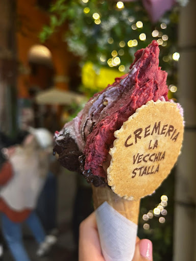 Read moreThe gelati at the Cremeria la Vecchia Stalla was the second gelato tried on my trip to Bologna. I got a cup with 3 flavors. It came with a pretty decorative wafer. For my taste, I thought the gelato was okay. Not great. The gelato was soft and sort of melting. The Carezza Africana (chocolate with marinated cherries) was like chocolate sauce with cherries. The cuiri cuiri pistachio had nice bits of pistachios in it, and the last flavor had crunchy biscuit pieces. This shop has a long list of specialty âcomposedâ combinations of gelati. Then there is also a classics list. I probably should have tried the latter since my trio of flavors were from the specialties list which I am not a fan.