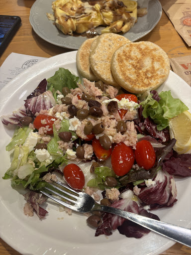 We've come to eat here every night since we arrived at Bologna because it's in front of our hotel, and we have liked it more and more everytime.The restaurant is located inside the train station and it's quite accessible. There is a perfect relation between quality and price. The first time we ordered pasta with pumpkin filling and ragu sauce, which was homemade and really well done. The pasta was fresh and perfectly cooked. We also ordered a salad with prosciutto and mozzarella and it looked as amazing as it tasted. The mozzarella was very rich in flavor and the salad was very big. Also the tigelle they put with the salad were very nice! The second time we went for dinner and had a croissant and the roast beef with potatoes, which was really well cooked and not dry at all. And the third time we had a mortadella tigella and a cesar salad. We still have 1 more night here and no doubt we will come...