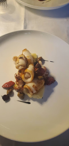 I ate three fish courses starting with salmon tartare with aromatic fish broth which was served with a nice loaf of hot bread. The first course was risotto served with raw fish (ombrina). This presentation was superb. It started with the fish in two small rows with the rest of the base on plate and risotto spooned over top. The risotto was brought the table in a small copper pot. Last was calamari served over mashed potatoes with olives and sun dried tomatoes.