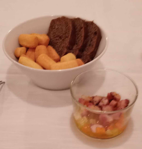 I was first served with hard bread, some nuts, and marinated octopus. They were all light and good. I started with grilled scallops with foie gras. It was a bit on the heavy side with a thick layer of foie gras for a primi, but I can see that duck lovers would love this dish. For a secondi, I had fusilli with sea urchin with a sprinkle of bottarga around it. It was probably the best pasta dish I ever had in my life. The chewiness of the noodle, the flavor of the sea urchin, and saltiness of bottarga were all perfectly mixed into one dish. For the main course, I had salted cod (baccala) in tomato sauce, which was again excellent. When I went to Spain twice in 2023 and Portugal in 2022, I tried bacallao in their respective cuisines but this one exceeded those I had in the other countries.
