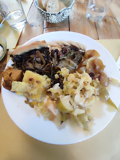 Ho provato l'hamburger vegano, che mi ha sorpreso per la sua ottima consistenza e per il fatto che non avesse quel sapore troppo marcato di peperone, cosa che spesso accade con altre varianti vegane. Inoltre, ho assaggiato due fettine di torte salate, entrambe coloratissime e incredibilmente gustose, preparate con verdure di stagione. In particolare, quella con la verza viola e quella con i cavoletti erano davvero speciali.