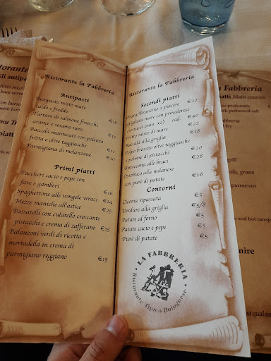 Read moreHo mangiato a "la fabbreria" insieme alla mia ragazza il 3 ottobre a pranzo. La zona del ristorante è facile da trovare perché è piena di indicazioni, l'ingresso sembra l'ingresso di una casa privata (si dovrebbe mettere un cartello più visibile). Ha anche il parcheggio privato (ottimo!). Il locale è molto carino, c'è anche una veranda esterna ma visto il maltempo siamo stati all'interno. Io ho ordinato un antipasto di culatello di Zibello e pane caldo, la mia ragazza il tradizionale antipasto di salumi e crescentine. Come primo io ho ordinato le classifiche tagliatelle alla bolognese, la mia ragazza i tortelloni ricotta e noci. Credevo che al calice ci fosse solo il classico vino della casa, invece mi è stato proposto un ottimo Montepulciano d'Abruzzo!! Il culatello è stato portato insieme a dei riccioli di burro in una coppetta con del ghiaccio (favoloso!!!) Sia il culatello che il crudo erano tagliati leggermente spessi, però erano OTTIMI, senza un filo di grasso. Alla mia ragazza hanno portato anche il classico gnocco fritto (veramente buono!). Le tagliatelle erano abbastanza buone. I tortelloni erano spettacolari!! 2 antipasti+2 primi+acqua, vino, caffè e coperto - sconto 20% di thefork 54,40€. Accettata...