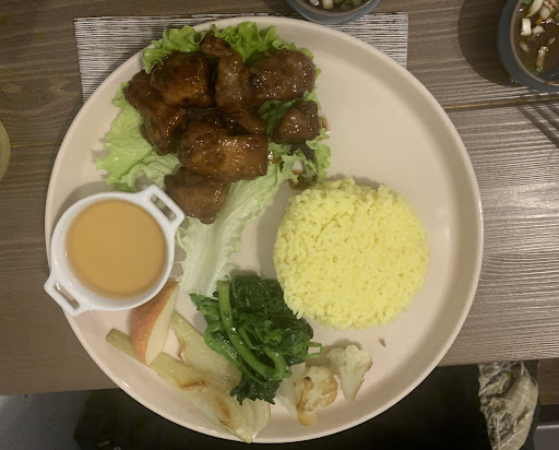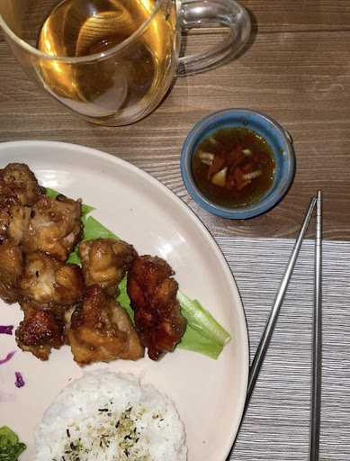 🥢 CONIGLIO al QUADRATO bocconcini di coniglio disossato (Macelleria Agnoletto), marinato al lemongrass, servito con riso, verdurine e salsa agro-piccante, ciotola di brodo di ossa di coniglio con menta