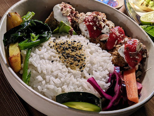 🥢 KOFTE DI MELANZANE polpette di melanzane viola al profumo di Medio-Oriente, servite con riso, salsa di fragole, chimichurri, mandorle bio di Az.agr. Sorelle di Pino, salsa teriyaki