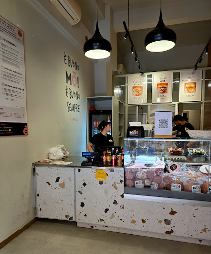 The MÓ Mortadella Lab location on Via de’ Monari had a long line when we passed by, so we headed to their second spot on Via San Vitale, just a short walk away, and were glad we did. No line, no fuss, and we were able to order right away.
