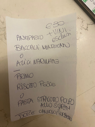 Read moreNote: Un solo cameriere a gestire tutti gli ambienti: abbiamo atteso 25 Min solo per poter ordinare, altri 5/10 min per una bottiglia d'acqua e le posate. Il locale non era pieno, piuttosto è assurdo lasciare tutto in mano ad una sola persona. Faccio presente che abbiamo pagato 3€ di coperto a testa. cibo: 23€ per 100/120g di orata semplicemente arrostita con zucchine alla scapece, è un furto. Con questa cifra mi sarei aspettato una porzione un po' più abbondante. Il valore effettivo del piatto è inferiore ai 10€(considerando 20€/kg). Orate pregiate arrivano anche a 60€/kg, per cui, considerando per eccesso 200g, dovremmo essere sotto i 18€, considerando anche il contorno e la preparazione (ripeto, 200g, non 120g). Concludendo, abbiamo speso 60€ in due per un secondo mini, un antipastino in due e acqua del rubinetto in bottiglia anonima a 1€ (tenendo conto che le tubature del centro non sono messe proprio bene, spero almeno filtrata). Fate voi, spero migliorino questi aspetti perché la materia prima c'è e il posto è carino.