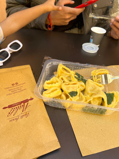 I waited about 15 minutes. I had lasagna and tortellini. The lasagna was the best I’ve ever had. The balance of tomato and béchamel, the softness of the pasta, and the ease of cutting it, along with the spices … everything was great. The tortellini was nice too; I also bought fresh tortellini to take home. Since cream always feels heavier to me, I prefer lasagna, but the tortellini was very good as well. You can see them being freshly made at the place where you pay. The staff is very friendly and helpful. They serve the food as takeout, so there’s no place to eat inside. Many locals take the pasta ar home. If you buy a drink from the café/bar next door, they allow you to sit and eat there. Opening the package is a bit tricky, but it was still a nice, different experience. It feels less touristy and more like you’re enjoying...