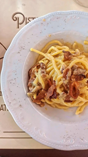 Prima volta nel ristorante romano, devo dire che mi sono trovata molto bene. Inizialmente ho aspettato un paio di minuti prima di essere accolta, ma essendo sabato sono super scusati. Mi accompagnano al tavolo e poco dopo sono servita da un cameriere super gentile e cordiale che mi indirizza sui piatti tipici della cucina romana. Nella mia indecisione, ha saputo consigliarmi egregiamente. Ovviamente, la carbonara era d'obbligo. Cremosa, saporita e con il guanciale super croccante, insomma, fatta come dio comanda. Come seconda portata ho ordinato l'abbacchio a scottadito con contorno di cicorietta saltata aop (aglio, olio e peperoncino) consigliata dal cameriere. Che dire ragazzi, cottura perfetta dell'agnello , succosa, morbida e saporita (cosa da non sottovalutare, dato che ormai la cottura della carne è un terno al lotto) e l'accompagnamento della cicoria, delicata ma altrettanto saporita (assolutamente non amara) insieme al pane casereccio di loro produzione ha fatto sì che ci fosse un'armonia tra i tre elementi. Mi sono goduta ogni singolo boccone di agnello e di cicoria, volevo quasi fossero infiniti. Dulcis in fundo, potevo non prendere il Maritozzo? Parto dal presupposto che sia il primo in assoluto che mangio in vita mia. Nel complesso l'ho trovato buono, un fine pasto non così pesante come ci si immagina. Uniche due pecche, probabilmente avrei montato la panna con un pizzico di zucchero in più e avrei scaldato il Maritozzo in modo tale da non farlo seccare. Del resto, do a questo dolce un bel 7. La cordialità del titolare, seguita dai camerieri mi ha fatto sentire quasi in famiglia e sicuramente balena nella mia mente l'idea di tornare a mangiare. Infine, vorrei nuovamente ringraziare il titolare per avermi offerto un bicchiere di amaro affumicato prodotto a Tivoli. Consiglio pienamente di trovare il tempo per andarci e lasciarsi trasportare come foste in una...