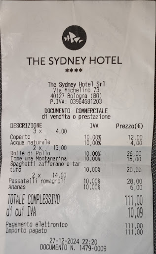 Ristorante di hotel a 4 stelle vicino alla fiera di Bologna, si presenta come un posto medio alto come impatto. Però diverse cose nn sono state all' altezza...arrivati ci è stato offerto uno spumante di benvenuto e 4 mozzarelline fritte, due tartufate e due normali, pignoleria ( ammetto) noi eravamo in 3, forse sarebbe stato più d'effetto che ve ne fosse un'altra coppia. Degli antipasti nota di merito per antipasto di pesce: Come montanarina...". I primi: passatelli con ragù di salciccia e porcini, discreto il ragù, però nei passatelli nn si sentiva assolutamente la forma... Le tagliatelle con tartufo bianco...il direttore di sala ci avvisa che nn c'era il tartufo bianco, ma se si voleva potevano mettere quello nero, ovviamente con aggiustamento di prezzo per la differenza. Le tagliatelle, purtroppo, erano cariche di burro e ciò ha coperto il sapore del tartufo ( nn che ve ne fosse in abbondanza). Dessert, ananas: buono. Nota sul conto, arrivato a pagare mi ero dimenticato del cambio di tartufo nelle tagliatelle, solo a casa me ne sono ravveduto e controllandolo ho notato che il prezzo era quello al tartufo bianco. È pur vero che il riferimento al cambio di prezzo mi era stato indicato dal direttore di sala e nn mi era stato detto, cmq, di farlo presente al pagamento, Immagino che la differenza nn fosse così importante, ma il...