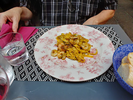 Chris had the Tagliatelli with shrimp, arugula and sun-dried tomatoes. My taste of it revealed a dynamic dish with enough acid to cut, yet not mug the shrimp. Delightful.
