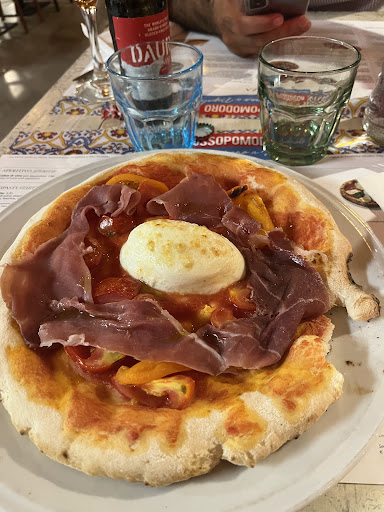 Ordiniamo una margherita e una capricciosa, due sole pizze, e semplicissime. Il locale continua ad essere quasi mezzo vuoto, eppure aspettiamo quasi mezz'ora di tempo. Nel frattempo, oltre a constatare l'esageratezza dei prezzi nel menu, ci cade l'occhio sulla tovaglietta di carta (1,50 euro di coperto...), che recita: "Stai gustando un patrimonio".
