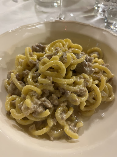The atmosphere was wonderful - rustic and dignified. For antipasto we had local cheese with fig spread and salumi. All was incredible, particularly the fig spread. We then ordered tagliatelle and gramigna which were both immaculate! We could not decide which was better. We paired our meal with a glass of San Giovese red wine which was full in flavor with no after bitterness. Absolutely wonderful. We ended with tiramisu made with their mascarpone and two Amari. 5/5 for sure.