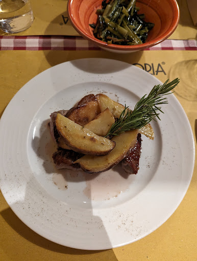 Our first surprise was before the orders (more on that later) arrived: the bread. It's actually sourdough, extremely tasty. Right on time, the food arrived. Sirloin and potatoes (one of Buono's specialties), tagliatelle con ragu and seasonal panfried vegetables (tasted like friarelli but could be mistaken). The meat was amazing, with thicker parts rare and thinner parts medium. Thick salt crystals on the vegetables combined terrific with the potatoes. My partner's tagliatelle was extremely well balanced, not relying too much on tomatoes or meat but instead letting all ingredients do their equal parts. Super impressive to still be impressed after five nights in Bologna.