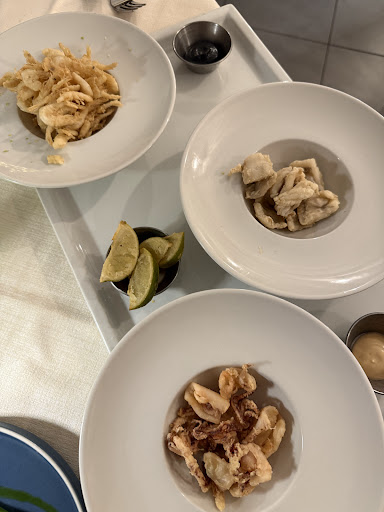 Read moreAvendo voglia di mangiare pesce, decidiamo con un amico di venire a provare questo posto. Posto fuori dal centro ma molto carino, ci sediamo e iniziamo prendendo il fritto Sabbia Di Mare con Gamberi Bianchi e Lime fritto, Calamari Borsotti e maionese al nero di Seppia, Moletti e maionese di crostacei, €21, buoni, e le Canocchie semicrude grantinate alla moda di Romagna, la sua maionese e porro alla brace, €23, molto buone. Di primo prendiamo Cannelloni al ragù di gallinella, crudo del giorno in dry-age, besciamella di fumetto e salsa beurre blanc €25 e non erano male ma il ragù col pomodoro copriva molto i sapori del resto, e poi anche Monfettini all’uovo con ragù di seppia e maggiorana, €19, ma anche questi non mi hanno fatto impazzire. Di secondo prendiamo l’Agrodolce di SLIM ( triglia, mazzancolle e sogliola) / Vapore di Mare al limone e verdure di stagione alla brace, €25 ed il pesce del giorno frollato, che insieme ad un altro paio di piatti erano le uniche cose frollate del posto, cosa che invece essendo la caratteristica, pensavo di trovarla in più piatti, comunque entrambi i secondi non mi hanno fatto impazzire, così tanto meno le porzioni. Abbiamo concluso con i dolci di cui Semifreddo di Banana e “Nutella”artigianale, Mou al Caramello Salato e Caviale di Lamponi, €8 e la Mezza Tarte tatin, mezza Torta della Nonna, €8, non male la prima, molto buona la seconda. Coperto 3.5€ a testa, totale 90€ a testa. Allora servizio l’ho trovato si cordiale ma un po’ lento, costi alti e rispetto alla soddisfazione finale devo dire che non credo siano adatti a...