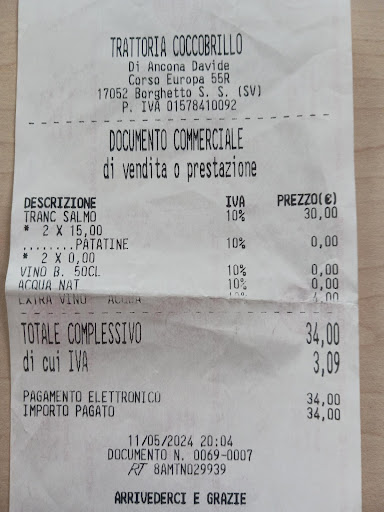 Read moreVivo a Borghetto SS circa due mesi all'anno e tutte le sere esco a cena in qualche ristorante o trattoria. A parte i 6/7 luoghi conosciuti e apprezzati in zona ogni tanto ci avventuriamo in qualcuno di nuovo. Sabato scorso passeggiando ci siamo fermati alla Trattoria il Coccodrillo per un menù economico con secondo/contorno/bere da 15€ perchè non avevamo fame. Ora non voglio recriminare il cibo (una fetta di salmone microscopica e patatine molto unte) perchè sono consapevole che con 15€ non si possa pretendere molto ma quello che mi ha fatto incavolare è stato il costo della bottiglia d'acqua, tra l'altro di depuratore, pagata 4€!!! ho chiesto informazioni all'esercente e la risposta è stata che da loro è questo il prezzo. By By...