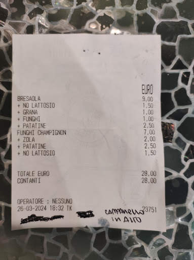 Read moreBuonasera, Beh che dire, Pizza buona l'abbiamo ordinata alcune volte, peccato per questa serata. Abbiamo ordinato la pizza e oltre a non arrivarci uno scontrino fiscale, l'aggiunta di patatine è stata pagata come una porzione piccola di patatine per ogni singola pizza, quindi 2.50€+2.50€. Abbiamo controllato il menù sul loro sito e c'è scritto che le aggiunte fuori da bufala, salumi, stracciatella, costano tutte 1€.