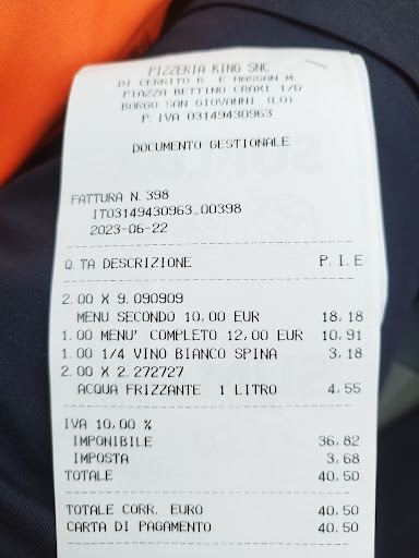 Read moreSiamo stati a cena per una festa di famiglia. Mi avevano raccontato di porzioni abbondantissime e sazianti e invece…la delusione sui visi di chi aveva ordinato il fritto di pesce. Pochissimi pezzi nel piatto per una porzione pagata 17 euro. Io invece ho preso una delle pizze king, il calzone, e tutta la notte sono stata con i bruciori di stomaco (ed ho bevuto solo acqua). Buono il dolce ferrero rocher, che peró a quanto ho capito era l’unica cosa non fatta da loro. Il locale è ben tenuto, ma abbiamo notato sulla tavola macchie sulle tovaglie e anche dei buchi. Non ho particolarmente apprezzato il modo di fare del gestore de locale, poco cordiale secondo me, ed il fatto che sono arrivate al tavolo le pizze dopo che gli altri avevano ricevuto il fritto, costringendo alcuni commensali guardare gli...