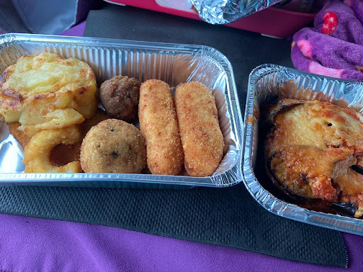 Ici on va au comptoir et on choisit entre lasagnes, calamars , legumes, poulet , panadas, scampis .. Le comptoir est plein de plats différents et réchauffage possible si on.choisit de manger sur place . C'est aussi un supermarché