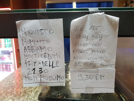 Read moreEs increible, creo que no soy el primero ni el ultimo, pero no recomiendo este sitio a ningun turista. Es la segunda vez que venimos para coger 4 trozos de pizza, para ver si son verdad las criticas de los que tienen tiempo para reservar con muuucha antelacion o son amiguetes que quieren dar mas fama que otra cosa. Y digo es la segunda vez, porque hace dos dias (un Sabado noche), nos presentamos para pedir unos trozos de pizza y nos dicen que si queremos pizza nos tenemos que esperar 1 hora, pues bien, entonces lo entendimos por el dia que era y porque habia bastante gente en la cola (al parecer con reservas). Pero lo peor como servicio es que volvemos un Lunes de tarde a las 19:00 y nos dice el mismo tipo de la primera vez, que si no tenemos reserva, hasta mas de las 21:20 no te dremos pizza. Vamos a ver si vengo a reservar y sin mirar una hoja de reservas ya contestan con estos tiempos de espera, una vez vale, pero dos, ya es pitorreo. O algo no funciona o discriminan a la gente, como puede ser que si vengo a pedir 4 miserables trozos de Pizza, me digan que hasta dentro de 2,5 horas no las puedan tener?. O tienen un pesimo y lento servicio o es que discriminan a los visitantes que no son habituales e Italiano parlantes. Ni en el restaurante mas lento tardan 2 horas en servir un trozo de pizza, Señores, con la rapidez que nos dijeron la espera, sin mirar un puñetero papel de reservas, está claro que tal y como ya han contestado antes a otro visitante con el mismo problema y comparandose con una discoteca, ustedes deberian colgar en la puerta, "derecho de admision". Supongo que con la clientela local ya les funcionará el negocio. Pero por este tipo de cosas y con un servicio así, no recomiendo a ningun turista venir. Señores no hagan perder el tiempo a...