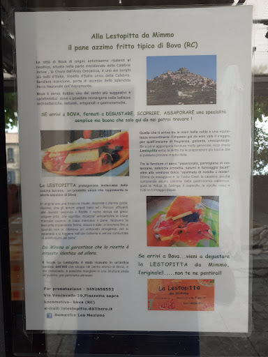 Read moreSono contenta di aver trovato questo posto di ristoro al borgo di Bova, sulla stradina appena sopra il treno esposto. È piccolo, molto semplice ma autentico, una vera scoperta in tutti i sensi. Mimmo, il gestore, è simpaticissimo, fa tutto da solo quindi bisogna avere pazienza, ma questa "lestopitta" che non avevo mai sentito nominare e non sapevo cosa fosse non potevo lasciarla scappare e siccome la curiosità ha ammazzato il gatto...mi son lasciata morire di gusto😃. È tipo una piadina e anche se gli ingredienti sono semplici (farina di grano duro, farina di grano tenero e acqua) il risultato è molto particolare, di un colore giallastro tenue, morbida e leggera. A me non piacciono le piadine, però questa l'ho mangiata con gusto, ci sono diversi tipi di farciture, ho preso la De Luxe Plus con la porchetta e melanzane grigliate. Troppo buona!! Finalmente una novità meritevole! Due Deluxe Plus e due birre a soli €25 e per di più Mimmo ci ha offerto il caffè. Cosa volete di più...