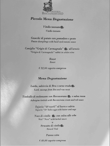 Read moreSedersi ai tavoli della storica osteria del Boccondivino è uno dei piaceri della vita. L'osteria è situata in un tipico e bellissimo cortile nel centro storico della ridente città di BRA. E' la sede storica di Slow Food, il movimento enogastronomico artefice della rinascita della cucina e del vino del Piemonte e dell'Italia. Come non ricordare la grande Maria Pagliasso, con le sue mani magiche, che negli anni 70 ha fatto riscoprire la grande cucina del territorio, con i suoi mitici tajarin, rigorosamente fatti a mano, dando nobiltà ad uno dei piatti simbolo del Roero e delle Langhe. Uno staff di ragazzi giovani, gentili, professionali, entusiasti e simpatici di accoglie con un sorriso e ti fanno accomodare nelle salette con gli antichi soffitti in legno, con pareti candide e nei tavoli dove sono passate generazioni di appassionati della grande cucina del Roero. Un menù non kilometrico, indice di qualità, con buona scelta tra antipasti tipici della zona, con un sapiente tocco di innovazione nel solco della tradizione, primi fantastici , fatti rigorosamente a mano, secondi piatti di grande attrattiva, con la possibilità anche di pesce e dolci da favola. Una carta dei vini , fiore all'occhiello di Slow Food, chiara, ben suddivisa, con etichette giuste del territorio e non solo e soprattutto prezzi molto corretti. Abbiamo gustato stupendi carciofi scottati con tartrà, una antica salsa locale, un tonno di coniglio da ricordo, le tagliatelle con il sugo di salsiccia di Bra imperdibili, gnocchi al raschera gustosissimi e leggeri. Uno del gruppo non ha saputo resistere all'assaggio del polpo croccante. Un semifreddo casalingo con nocciole e pistacchio ha concluso una indimenticabile cena. Per i vini siamo andati sul sicuro con una delle migliori cantine del Roero, quella di Giovanni Almondo di Montà con il fantastico Arneis Bricco delle Ciliegie ed un Roero 2019 per sognare. Un tocco di Spagna nel finale con un Pedro Ximenez 1994 .Prezzi veramente corretti per una cena che ti riconcilia con la vita e riesce a farti dimenticare tutte le problematiche del complicato momento. Un grazie di cuore agli splendidi ragazzi dello staff!! Siete unici, mantenete questo entusiasmo e questa simpatia. Torneremo prestissimo, per...