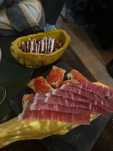 Read moreambiente piccolo ma non angusto con uno spazio esterno. A causa del poco spazio i tavoli sono un po' scomodi, sembrano quelli da bar. menù molto mirato e orientato verso la cucina spagnola. optiamo per vari giri di tapas: panino con calamari fritti (che non sapevano molto di calamari ma buoni), taco di maiale (buono), crocchette con trota e con cinghiale (la besciamella sovrasta), melanzane fritte (poche per quel prezzo ma buone) con miele e pecorino, patate con paprika (buona), tortillas, cozze (molto buone), affettati (tre fette di tre salumi 18 euro, decisamente da evitare). Tutto buono, qualche piatto al prezzo giusto altri un po' cari. due piatti di pasta non buonissimi e porzioni piccine. churros buoni ma tre churros 6 euro anche no. il servizio è un po' affannoso ma alla fine arriva tutto. personale gentile, ragazzi giovani che si danno molto da fare. esperienza piacevole con due critiche: mettete anche vino e birra spagnoli. qualche prezzo era poco giustificato come l'acqua alla spina in bottiglie da 750 a 3,50 oil misto di affettati. Credo che il piatto forte sia la paella, che non abbiamo preso ma la prenderemo la...