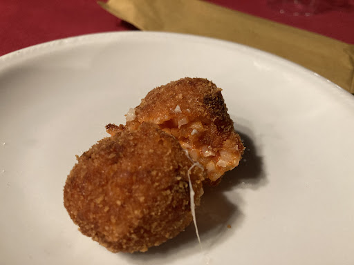 Allora la pizza aveva un impasto strano sembrava piu che altro un biscotto, sugo e mozzarella acquosi e purtroppo insapore, non si amalgamavano ci sono rimasto abbastanza male...mi consolo coi funghi almeno quelli sono sempre buoni, anche se pochi... Mi butto sul supplì, una specialità romana di cui sono molto ghiotto e...niente, un cosino dall'aspetto triste e unto, assaggio e mi arriva una bomba di sale che copre i sapori, riso a volte crudo...
