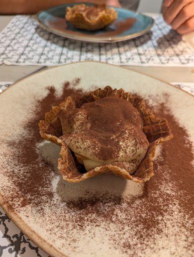 Na deze drie gangen zaten we behoorlijk vol, maar we hebben ons laten verleiden om tiramisu als toetje te nemen, die vers werd klaargemaakt. Dat klopt ook, want sommige stukjes van de lange vingers waren nog krokant, heerlijk!