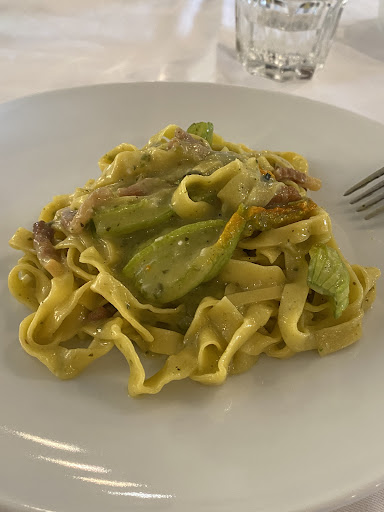 Ho iniziato con un primo piatto abbondante, le fettuccine ai fiori di zucca con pancetta croccante. La combinazione di sapori era incredibile, e la pancetta croccante aggiungeva una nota di sapore in più. Il piatto era diviso in due porzioni, il che mi ha permesso di assaporarlo ancora di più.