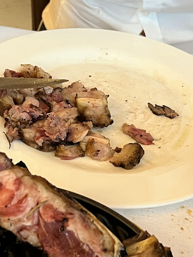 Ad ogni modo, ci arriva questa costata di circa 1kg (di solito su questi tagli la carne vene mostrata prima della cottura, qui no) Arriva già cotta su un carrellino e il cuoco la taglia davanti a noi: molto carino. Contemporaneamente arriva il contorno di patate al forno, molto buone. Iniziamo a mangiare la carne: grassissima e in alcune zone pure “nervosa”. Abbiamo avanzato un piatto intero di grasso.