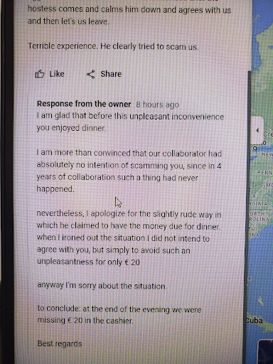 Now for the highlight of this terrible experience: We came to pay ( our bill was 53 euros) We counted the money and gave him 60€ and asked for 7 dollars in change, he made a joke and said he didn't have 7 dollars just 7 euros. As we laughed we see him take out a 5 from the cash register in a sneaky way and then proceed to say thst we only gave him 45€. We then continue by saying that we know we clearly gave him three 20 bills. He get aggressive and calls us liers. This continues until the hostess comes and calms him down and agrees with us and then let's us leave.