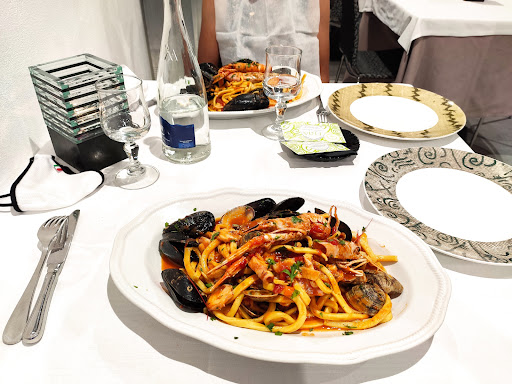 Siamo venuti a pranzo per la festa della mamma. A mio personale parere il locale mi sembra molto pacchiano, molto buio con delle lampade sul tavolo che nemmeno funzionano, ma quello va a gusti. Seduti al tavolo abbiamo atteso 15 minuti prima che dopo aver chiesto, ci portassero il menù e altri 15 per prendere l'ordinazione. Non ci hanno portato ne pane né gressini se non dopo che lo abbiamo chiesto. Dopo un ora dall'arrivo è arrivato il cibo. Impepata di cozze, con una pioggia di pepe sopra ogni cozza, e quasi la metà delle cozze con ancora la barba. Spaghetti allo scoglio molto buoni e saporiti e due fritti imperiali buoni. Sul servizio devo dire purtroppo molto scadente. Molto disorganizzati e lasciano la sala completamente sguardita e nessuna attenzione per il cliente. Anche quando abbiamo chiesto il caffè il cameriere sembrava scocciato per averlo chiamato. Nonostante il cibo era pressoché buono, al servizio va data...