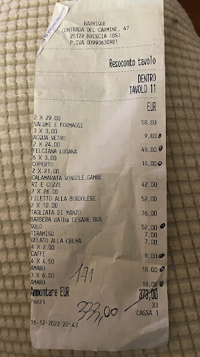 Prezzo: 🌟🌟🌟 Siamo onesti fino in fondo: i prezzi di questo locale sono decisamente oltre la norma. Se una persona osa fare antipasto, primo, secondo e dolce non spende meno di 100 €. Tuttavia, Barrique è uno dei pochi ristoranti in centro a Brescia che offre quasi tutti i giorni sconti dal 20 al 50% se prenoti su The Fork, oltre ad accettare anche gli Yums (i punti). Per cui se sei un po' sgamato, puoi tranquillamente mangiare bene (seppur senza scoppiare) in due con una 60ina di euro. Io ci vado ogni tanto (in coppia) e solitamente il mio scontrino va dai 50 ai 60 €.