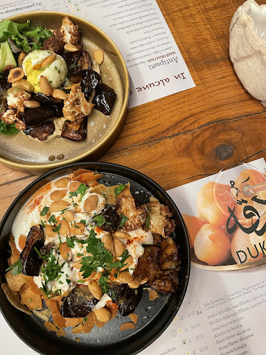 Gli antipasti misti (hummus, frittini, tabulè, ecc.) erano nella media, nulla di memorabile, fatta eccezione per l’hummus di ceci e l’halloumi fritto, davvero buoni. I miei falafel, per fortuna, si sono rivelati ben fatti e gustosi. Il polpo era ben fatto, solo un po' sapido per i gusti della mia amica. Tuttavia, il piatto scelto dalle altre due mie amiche – la Fatté di mazzancolle – è risultato squilibrato: eccessivamente acido e con appena quattro mazzancolle.