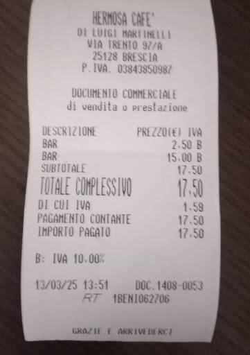 Read moreBella location, personale non adeguato al contatto con il cliente. Vivo a un minuto dal posto sono uscito di fretta con un euro pensando bastasse per un caffè, la ragazza mia ha risposto male perché mancavano 10 centesimi! Le ho chiesto scusa dicendo che abito li vicino ale che sarei ripassato, co amici ovvero possibili clienti, ma ha avuto un tono scorbutico ribadendo il fatto che mancassero 10 centesimi e che non si puo uscire di casa solo co un euro Mi sono offeso perché mi ha fattto passare per povero come se non potessi oermettermi di chiedere un caffè. Io so benissimo qua tocosta di media un Caffè a brescia ho fatto a posta per vedere la reazione del personale. Altrimenti sarei uscito con il portafogli. Non ve...