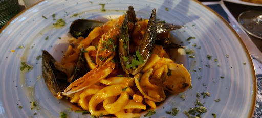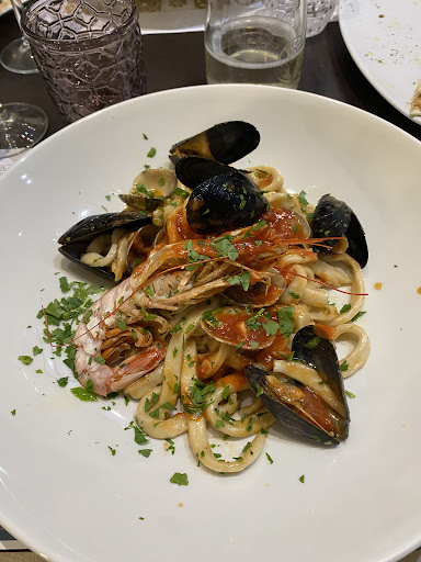 Read moreRistorante pizzeria molto carino che offre un ricco menù a base di pesce ad un ottimo prezzo. Cena per due, abbiamo voluto provare il menù Calamaro e il menù Polpo. Entrambi comprendono un antipasto, un primo, un secondo, il sorbetto, un caffè e una bottiglia d'acqua o calice di vino (29 e 35€ rispettivamente). Piatti buoni, alcuni un pelo troppo salati (il primo del menù calamaro) e altri con un po' troppo olio (antipasto e primo del menù polpo). In generale comunque molto soddisfatti. Interno del locale molto carino, con luci soffuse e ben decorato; adatto anche a cenette romantiche. Personale di sala molto giovane, gentile e disponibile. Per chi arriva in auto non è facile trovare...