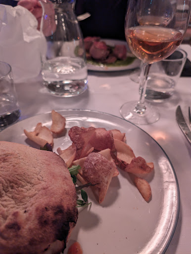 Read moreCucina mediocre servizio pessimo! Siamo arrivati e non trovano il nome della prenotazione, chiamiamo gli amici che l’avevano effettuata ma non prende loro il cellulare, chiediamo di ricontrollare ma nulla. Dopo dieci minuti passati all’ingresso cercando di capire, scopriamo che i nostri amici erano già seduti al tavolo, il nome della prenotazione era corretto ma dato che 2 su 4 degli ospiti erano già arrivati, all’ingresso hanno cancellato la prenotazione dall’elenco. Mentre questa “simpatica” scena si svolge, il responsabile riprende in malo modo davanti a noi una cameriera, poi ci fa accomodare senza neppure scusarsi. Ordino l’insalata di carciofi con misticanza, quando arriva mi sembra che nella misticanza ci siano gli spinaci ai quali sono allergica. Specificando che è colpa mia perché non mi sono informata prima di ordinare, chiedo al cameriere conferma, mi risponde in tono piccato “c’è scritto sul menù che c’è la misticanza DEVI sapere che nella misticanza ci sono gli spinaci”, una risposta del genere con un tale tono nei confronti del cliente è semplicemente inaccettabile, se in più si considera che manco ho chiesto di rifarmi il piatto e che mi sono assunta da subito la responsabilità è davvero fuori luogo. Una cameriera molto carina e gentile, coi capelli lunghi fino quasi ai fianchi e sciolti, ci porta via i piatti degli antipasti, quando si abbassa per prenderli i suoi capelli finiscono nel bicchiere di un amico, lei non se ne accorge neppure. Arriva la carbonara. Avete mai visto una carbonara color nocciola? Io mai, prima volta! Evidentemente il grasso del guanciale con cui è stato mescolato l’uovo è stato cotto un po’ troppo, per non dire bruciato, la pasta galleggiava nel grasso, dopo 3 forchettate impossibile proseguire piatto davvero troppo pesante (che mi ha lasciata indigesta facendomi passare una notte insonne) Abbiamo ordinato anche una gricia, stesso problema della carbonara. Il tonno mi è stato detto essere buono, come anche il tiramisù, mentre il tortino di pane carasau e la calcio e pepe nulla di speciale ma accettabili. Ad inizio serata la sala era fredda poi si è scaldata, la panca su cui ci hanno fatto sedere definirla scomoda è un complimento, a metà cena il volume della musica è stato alzato di molto impedendo di fatto la conversazione al...