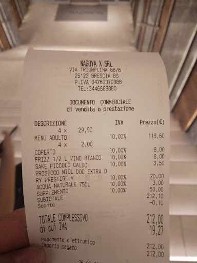 Read moreIeri sera ci siamo recati in 4,a cena in questo ristorante.Fatti accomodare in un tavolo con un'evidente lampada troppo attaccata alle teste di noi clienti.Premetto la piu alta di noi è 1.70 non 2 mt ma la lampada era comunque a 20 cm dalle nostre teste. Ordinato il primo giro di cibo e 1 bottiglia di prosecco.Premetto:uscivamo dal turno di lavoro ed eravamo stanchi si,ma più che sobri! Incidente maldestro di una di noi,che nel sollevare la bottiglia dal tavolo per versare il vino nei bicchieri,urta la lampada che va in mille pezzi.Non è stato certo un gesto atto a demolire volutamente il ristorante,ma un incidente che poteva capitare a tutti,anche solo con la bottiglia di acqua o un piatto passato. Ci hanno cambiato tavolo ma non i bicchieri ed alcuni piatti.Avevemo vetri perfino nelle scarpe. Sorpresa nell'arrivare a pagare il conto!!!Il ragazzo alla cassa ci dice che quelle lampade costano molto,che ha avuto modo di sentire la direzione e che dovevamo pagarla,visto che a suo parere costavano 250 euro.Ci avrebbero però fatto uno sconto e fatta pagare 50 euro. Eravamo tutti basiti e dicendo anche che essendo un ristorante dovevano esser assicurati,anche perché incidente non voluto. Abbiamo pagato il supplemento perchè dispiaciuti dell'accaduto,come da scontrino si può notare. Assurdo!!! Avevamo vetri in ogni dove,una lampada posizionata non in sicurezza,se ci fossimo tagliati,visto che i vetri erano anche nei bicchieri dove stavamo bevendo e nei piatti in cui stavamo mangiando,dovevamo pure andare al pronto soccorso! Una lampada che a dire loro costava 250 euro posizionata in modo dozzinale nel ristorante??? Eravate voi a dover pagare i danni a noi!Invece vi abbiamo regalato 50 euro oltre al costo della cena.I camerieri che non parlano una parola di Italiano e non conoscono neppure i piatti che stanno servendo! Senza ombra di dubbio non ci vedrete più,oltre ad invitare altre persone a non mettere assolutamente piede nel vostro locale,poiché di serio ed a norma di sicurezza lì...