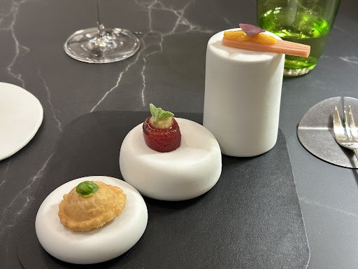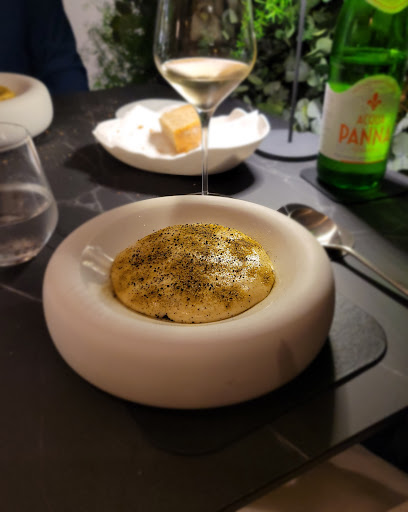Read moreCena con menú degustazione molto piacevole, atmosfera elegante senza eccesiva formalitá, servizio attento e puntuale. Abbiamo iniziato la cena con due antipasti di pesce, il primo era una tartare di trota servita con una mayonnaise di pesce, un ketchup di albicocca e la pelle della trota soffiata. Il secondo antipasto era uno scampo battuto, fino a renderlo un velo sottile, con yoghurt, melograno e yoghurt disidratato. Entrambe i piatti molto bilanciati tra grassezza del pesce e abbinamenti con elementi acidi, due antipasti freschi che aprivano molto bene il percorso degustativo. Poi abbiamo mangiato dei ravioli del plin con broccolo affumicato, tartufo e sarde essiccate. Questo piatto mi é piaciuto molto per la spiccata sapiditá e la cremositá del ripieno. Poi sono seguiti due secondi, uno di carne e l'altro di pesce. Il primo é stato un trancio di ombrina con una salsa al franciacorta, olio al peperone crusco, salsa al cerfoglio e dei pezzetti di cardo come contorno. Anche questo piatto é stato una piacevole scoperta, nonostante le salse dai sapori decisi, rimaneva protagonista l'ombrina. Il pesce era cotto perfettamente, morbido e con la pelle bella braciata. L'ultimo piatto salato é stato una parte di chuck flap (taglio americano simile al taglio del reale che abbiamo in Italia). La carne era scaloppata sottile e condita con un fondo di carne, accompagnata con una crema di zucca, qualche rondella di carota sbollentata, semi di zucca e gel di liquirizia. La carne era morbida e condita con il suo fondo aveva un gusto deciso, mangiata assieme alla crema e al gel era molto bilanciata. L'ultimo piatto é stata una piccola torta di rose con una salsa al lampone, inutile dire quanto fosse goduriosa. Lo staff é stato gentile e attento e piú volte ha interagito con noi per spiegare i piatti e assicurarsi che il percorso stesse andando bene. Esperienza...