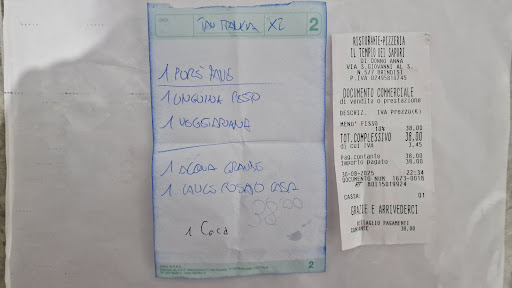 Read moreBonjour, Nous avons dîné ce soir au Tempio Dei Sapori, la cuisine était bonne, le service bien, jusqu'au moment de régler la table. La personne fait son calcul et note "38€" sur le ticket utilisé par le serveur pour prendre notre commande, il nous le tend côté dos "38€" et pas côté face (côté où la commande a été notée). Le montant paraissant correct nous réglons l'addition et en voulant jeter le papier une fois partis, nous nous rendons compte que ce n'est pas le détail du repas mais le ticket de commande qui nous a été remis. Evidemment aucun montant n'apparaît, et le total ne correspond pas à ce que nous avions commandé. Pour précision, voici les prix de notre commande : Purée de pois 6€ Linguines pesto 7€ Pizza végétarienne 6€ Eau plate grande 3€ Verre de rosé 4€ (au passage nous avons eu du vin blanc et l'avons gardé) Coca (petite bt) 3€ Le prix du couvert n'est pas noté puisque ce n'est pas une facture qu'ils nous ont donné mais il était de 2€ par personne donc 4€ au total. L'addition s'élève donc à 33€ et non 38€.